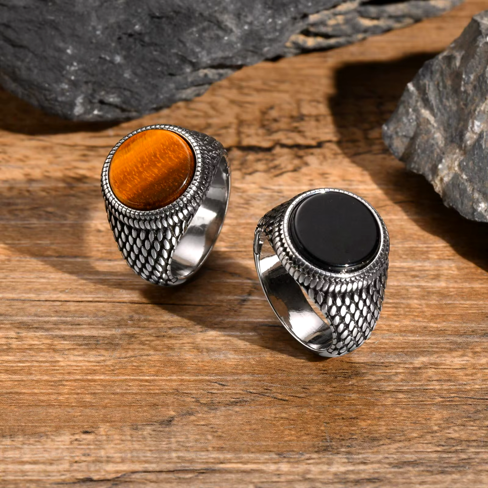 Forged with dragon-scale texture, this signet ring frames a smooth round stone on a solid stainless steel band. This ring channels strength and defiance, built for men who move with purpose.