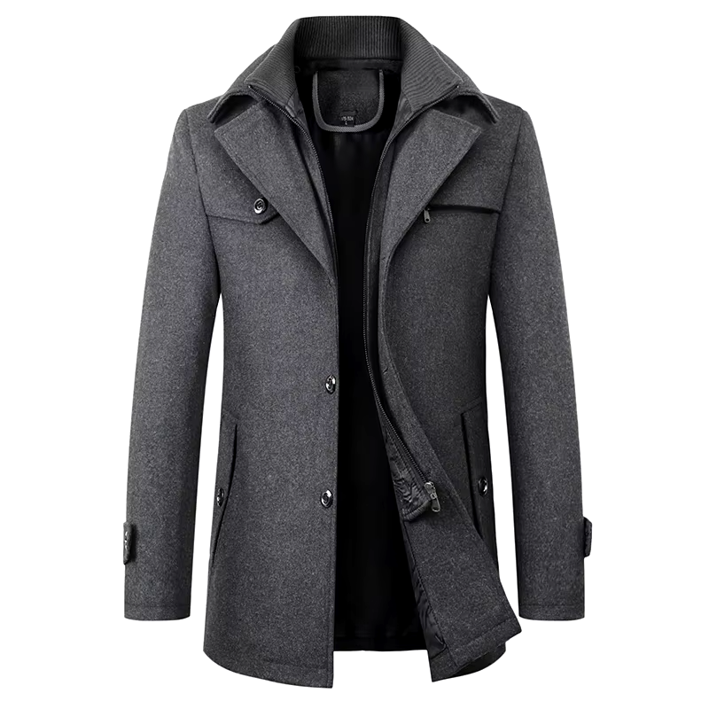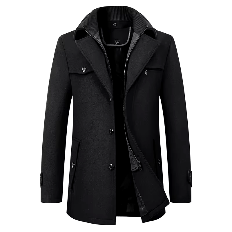 High-collar trench coat that embodies timeless style, a smooth finish that enhances its sleek look, and durable fabric designed for warmth and protection. Tailored for a comfortable fit, it's the perfect choice for versatile wear, elevating both casual outings and formal occasions.