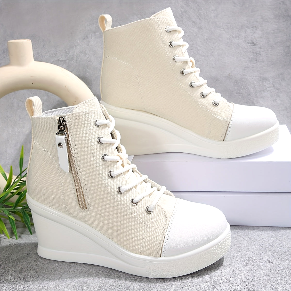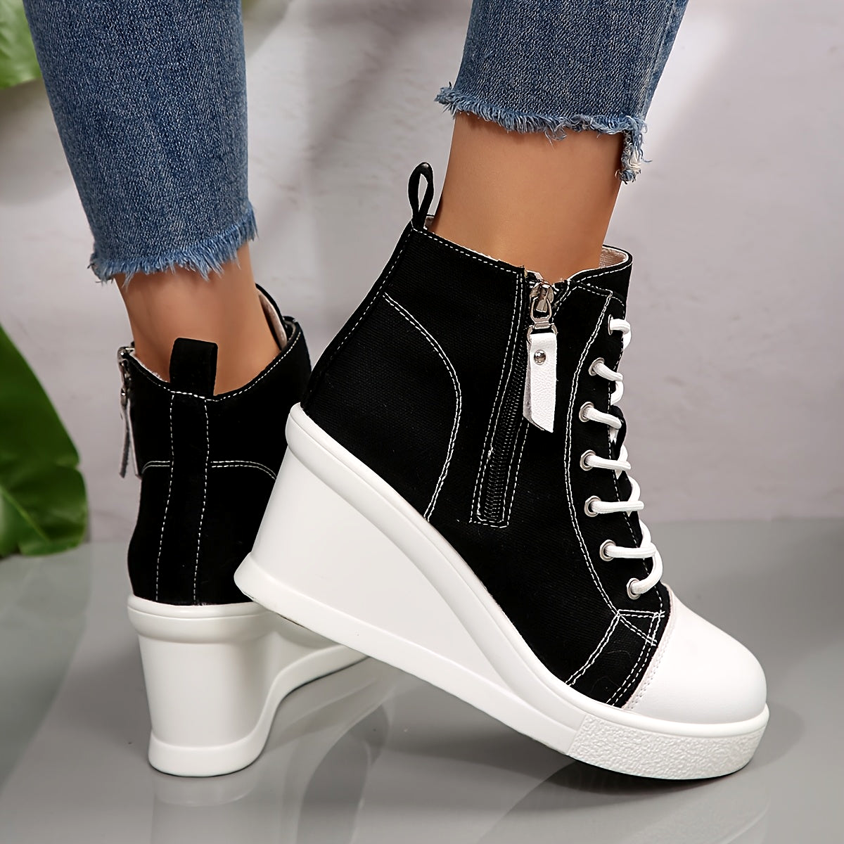 Built for streetwear edge, these canvas sneakers fuse a sculpted wedge heel with everyday comfort. Contrast stitching, a structured rubber toe cap, and a sleek side zipper keep the look sharp and easy to wear. Lightweight, breathable, and built to move, they're made to stand out.