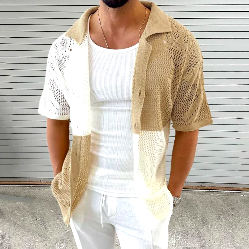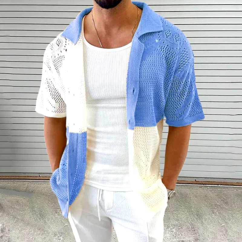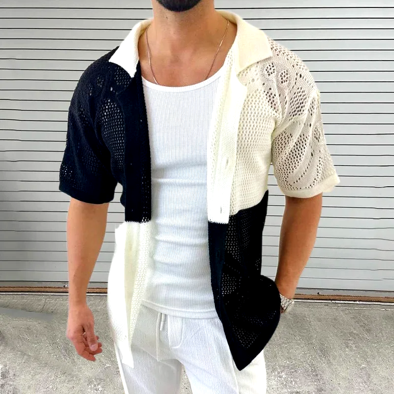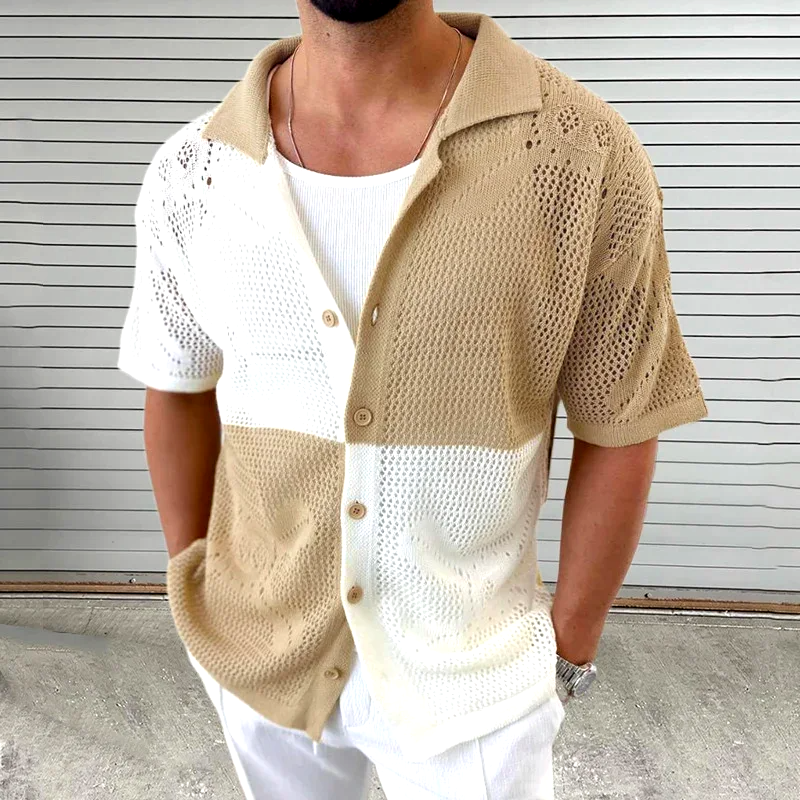 Vintage knit meets modern flair in this textured open-knit shirt, blending intricate patterns with a colorblock design, spun from breathable cotton so you can feel comfortable in and out. A casual-classy look—ideal for parties, resorts, or the beach
