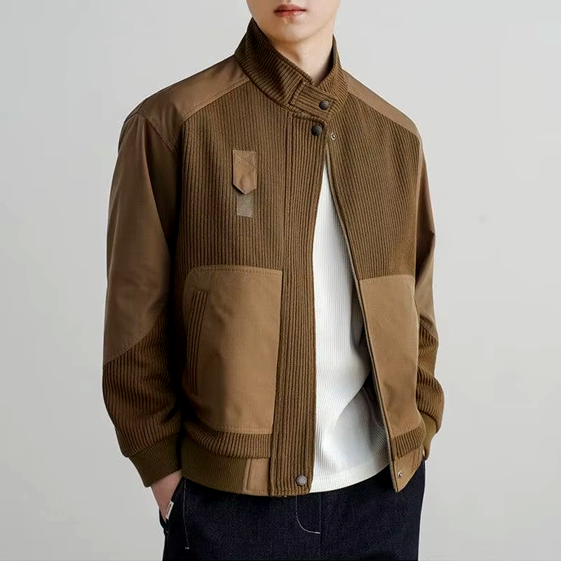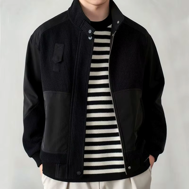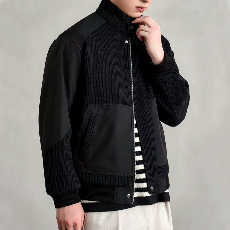 Ribbed knit body contrasted with canvas panels for a structured yet relaxed look. Lightweight build and easy fit make this jacket ideal for shifting temps and everyday movement.