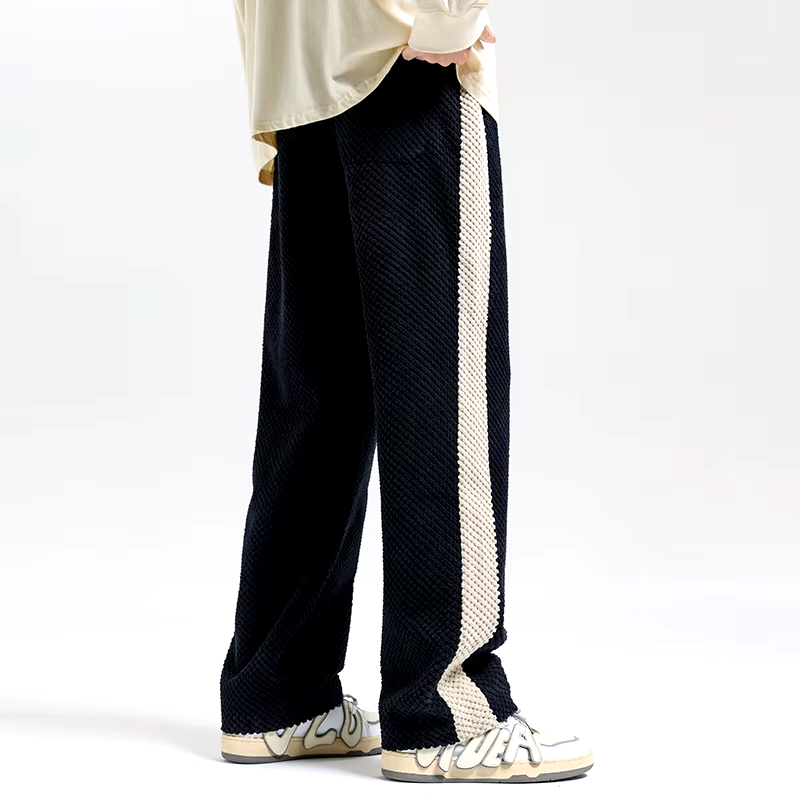 Waffle-knit texture adds subtle depth and softness, side seam stripe brings a street-ready style with a relaxed fit. These corduroy pants are lightweight but thick enough to keep you warm.
