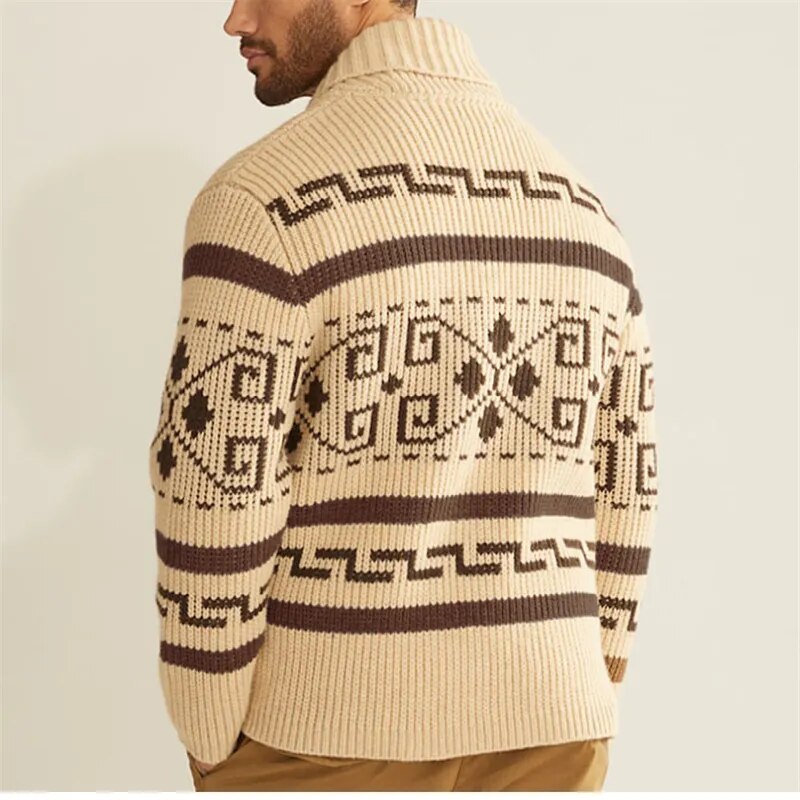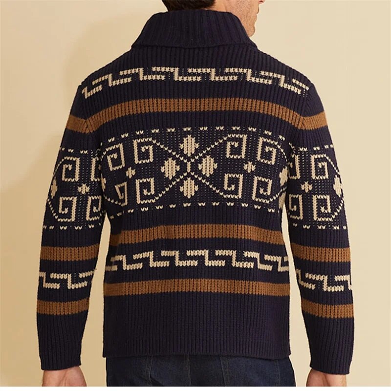 • Showcasing a Western-themed Jacquard knit featuring diverse herringbone patterns.