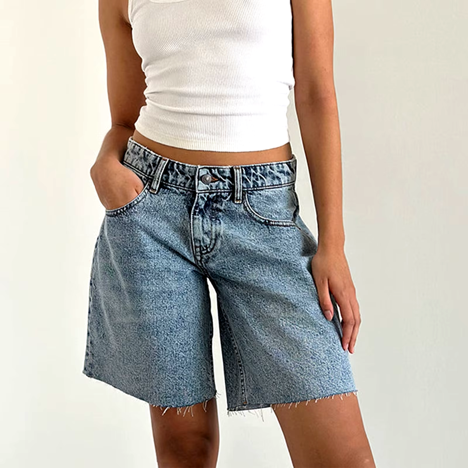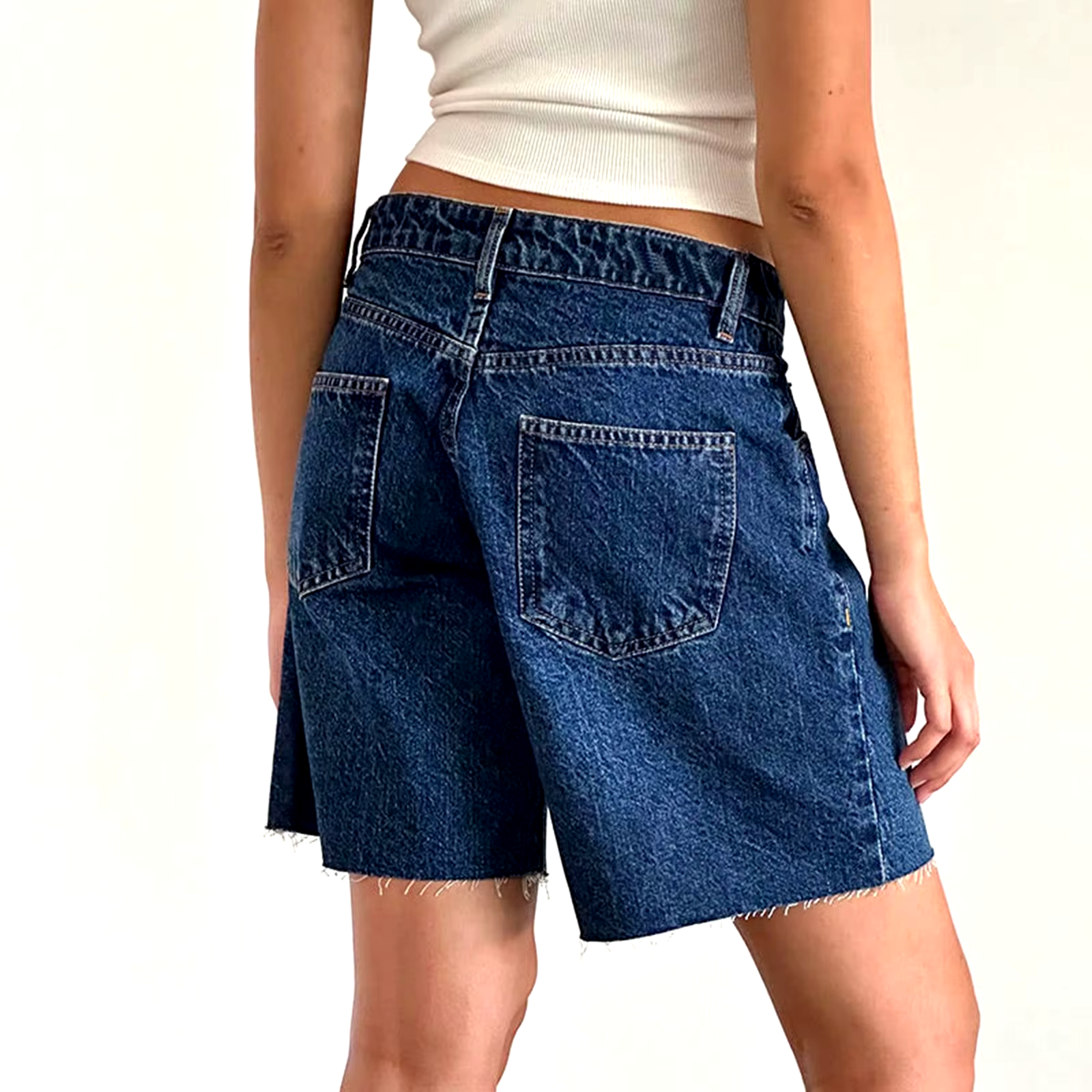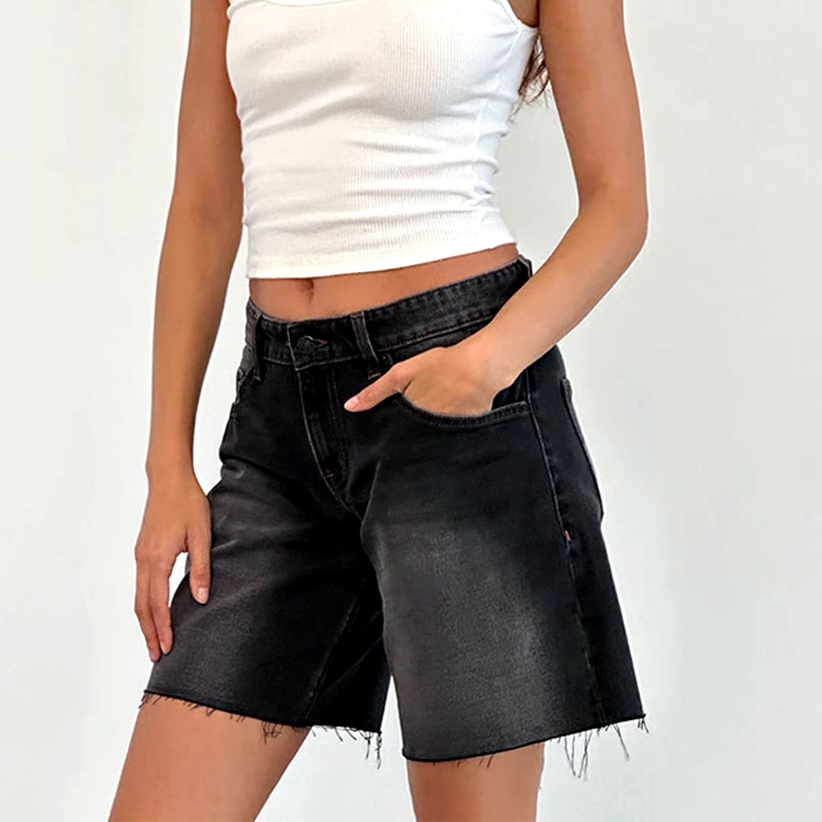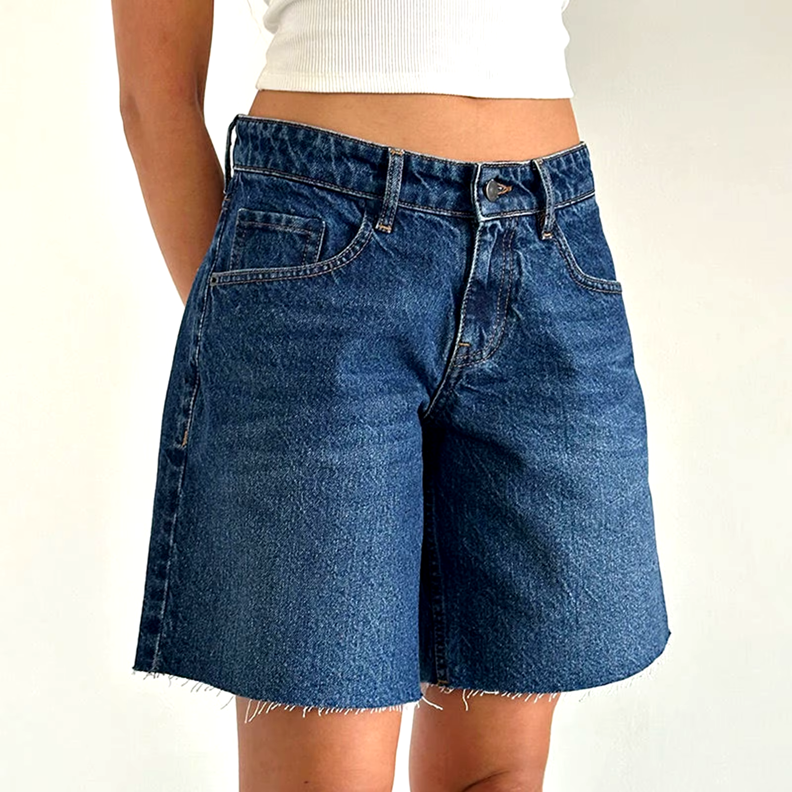 Vintage style that nods to old-school denim, cut in a high-rise fit with a wide leg and raw frayed hem for a worn-in finish. Crafted from comfort stretch fabric, this Bermuda short gives room to breathe and move with ease.